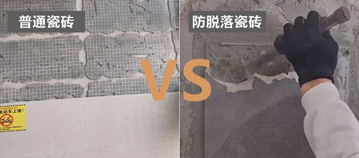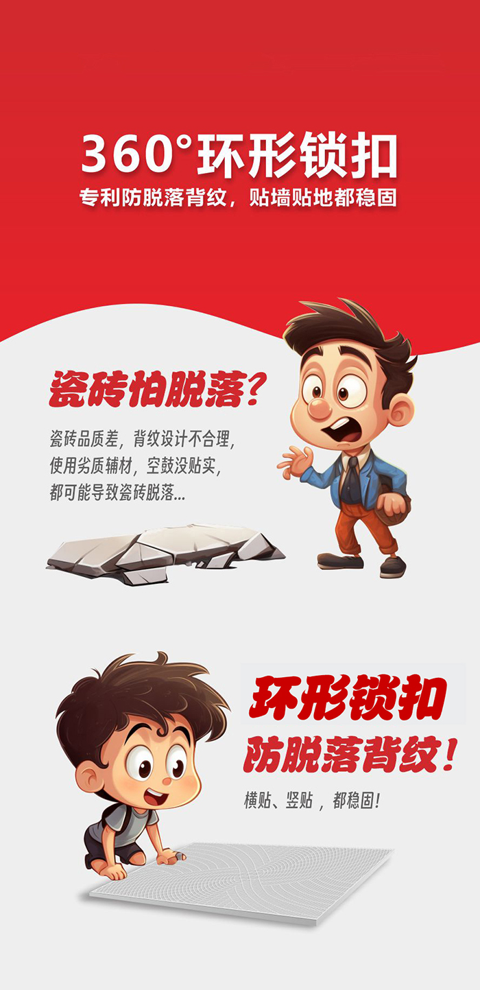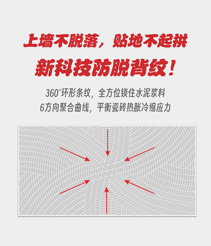 瓷磚背面填充水泥砂漿且干燥后,與背紋上的倒鉤相互鎖住產(chǎn)生物理抓力,從根本上預(yù)防瓷磚脫落,確保長(zhǎng)期安全。